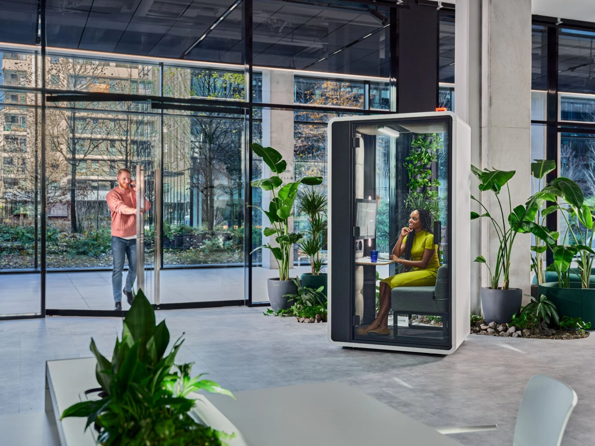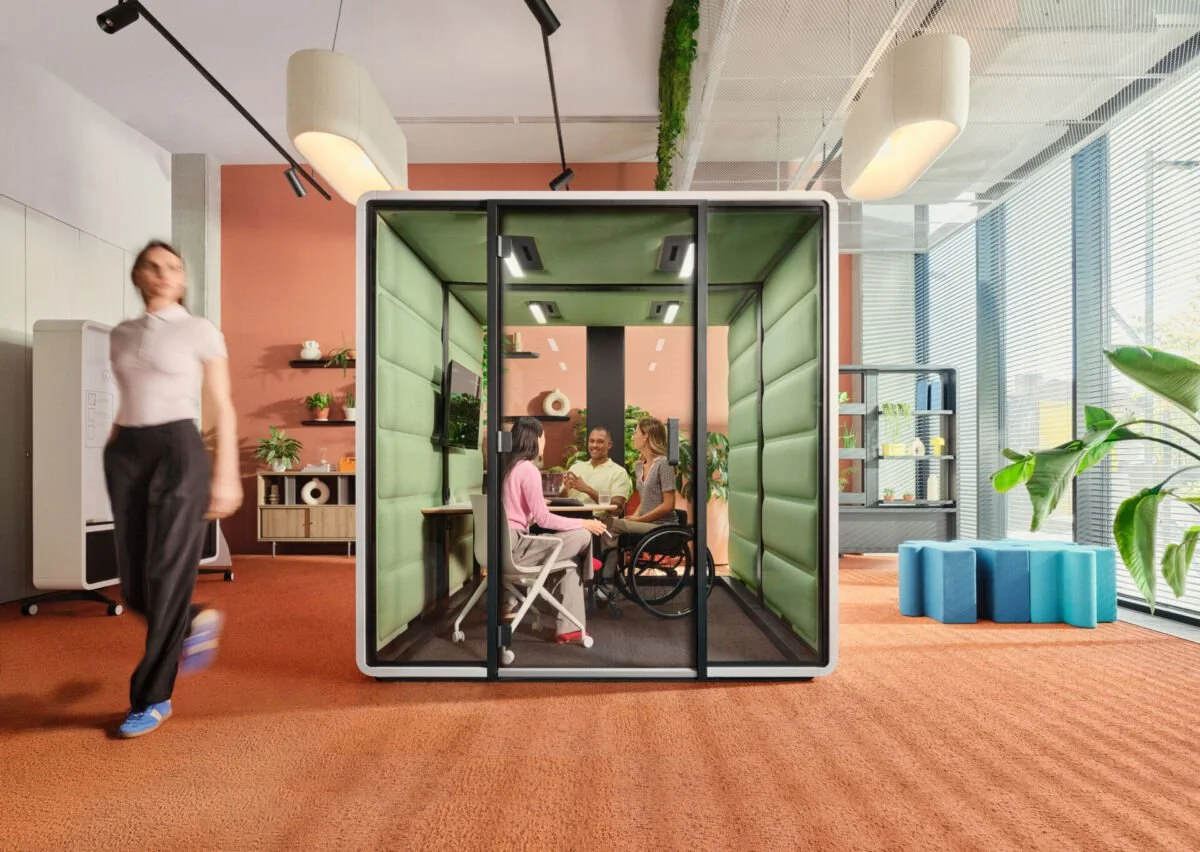 Privacy pods with Grade-A acoustic rating, air recycling, and lighting, built to international building code standards. hushFree pods are UL approved, in stock, and delivered within approximately 10 working days nationwide.