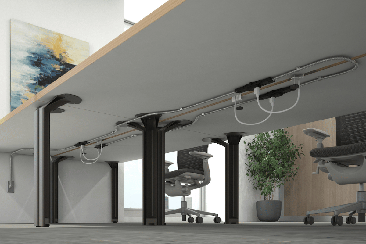 Array is both a power and data beam as well as a hub for accessories, creating highly flexible spaces. Array is endlessly configurable, with A-frame legs, 3- and 4-way posts, and 48”, 60”, and 72” wide beams.